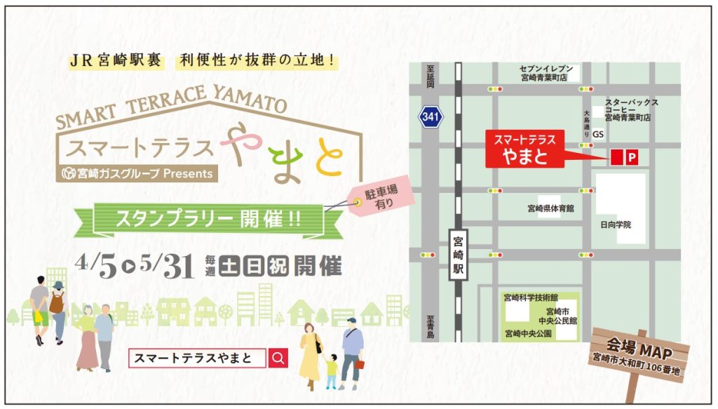 展示会場ではスタンプラリーも開催しており、ホテルニューウェルシティ宮崎の食事券2,000円分を抽選で30名様へプレゼントいたします。ぜひ、ご家族やご友人の皆さまもお誘い合わせの上「スマートテラスやまと」へお越しください。多くの皆さまのご来場をお待ちしております!